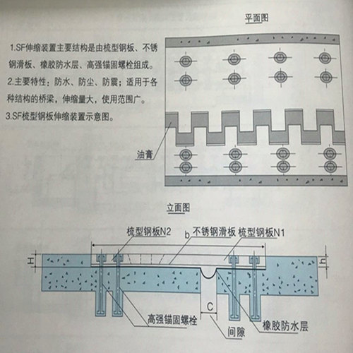 SF伸縮裝置主要結(jié)構(gòu)是由梳型鋼板、不銹 鋼滑板、橡膠防水層、高強(qiáng)錨固螺栓組成 2.主要特性:防水、防塵、防震;適用用手各一畫 種結(jié)構(gòu)的橋梁,伸縮量大,使用范圍廣。 3.SF梳型鋼板伸縮裝置示意圖。